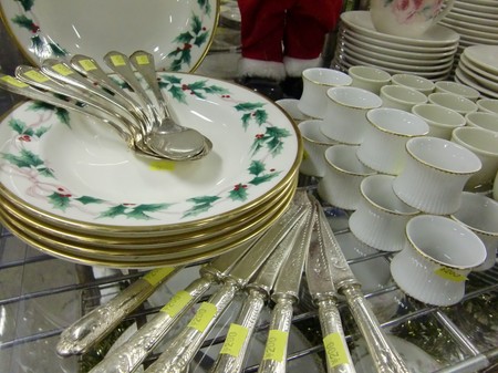 シルバーのナイフやスプーン、柊の葉の模様が描かれたお皿たち♪右隣のエッグスタンドは玉子の殻を使ってデザートのプリン容器にいかがですか?
