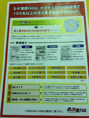 簡単で説明すると、ファックスでお店のチラシを周辺の会社に送るのです。