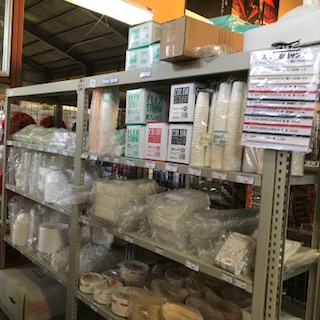 こちらは、丼容器や紙コップ・ストロー・紙皿が並んでおります。