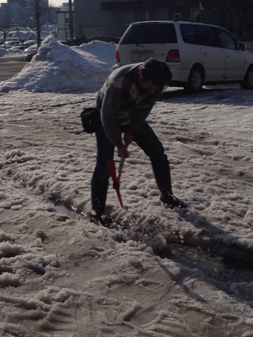そして、その水たまりの水を流す為につるはしで氷を割って川を作るんですよ...