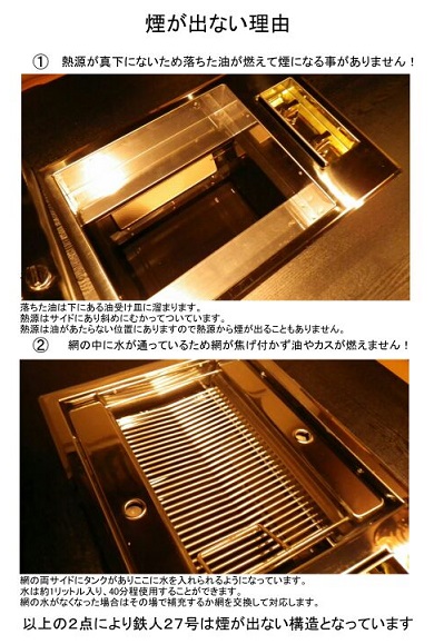 このロースターは、なんと網の一本一本に水が通っているため、熱を80度前後に保ち食材をじっくり焼き上げる!ということで誰でも簡単に"うまみのある焼肉が焼ける"訳でございます!しかもロースターの下には炭火ではなく水が貼ってあるため霜降り肉の脂が落ちても火が上がらない仕組みです=煙が出ないためダクト工事が不要となるため開業時の初期費用も抑えられますので非常にオススメでございます!