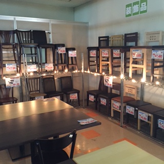 今までは風除室に新品テーブルのサンプルだけを置き、新品イスは店内の壁際にしれっと並ぶだけでした。