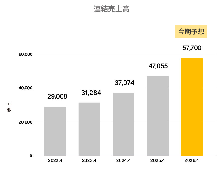 | 売上 | 30,134 | 29,195 | 27,014 | 29,008 | 31,284 | 37,074 | 47,055 | 57,700 |