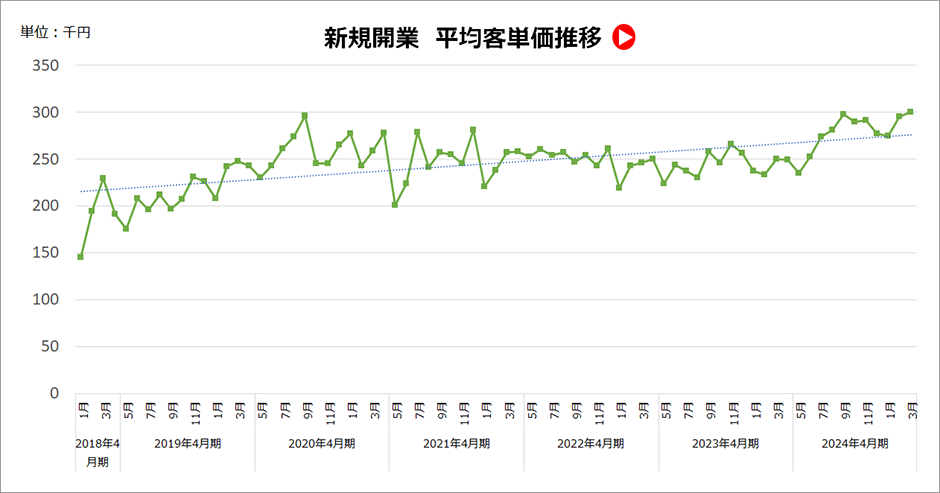 2024年3月の客数は前年比100%と横ばいとなり、新店オープン顧客の客数は前年比96%と減少しました。一方で新店オープンの客単価は122%、30万円を突破する等、弊社が注力している客単価は増加した結果となりました。